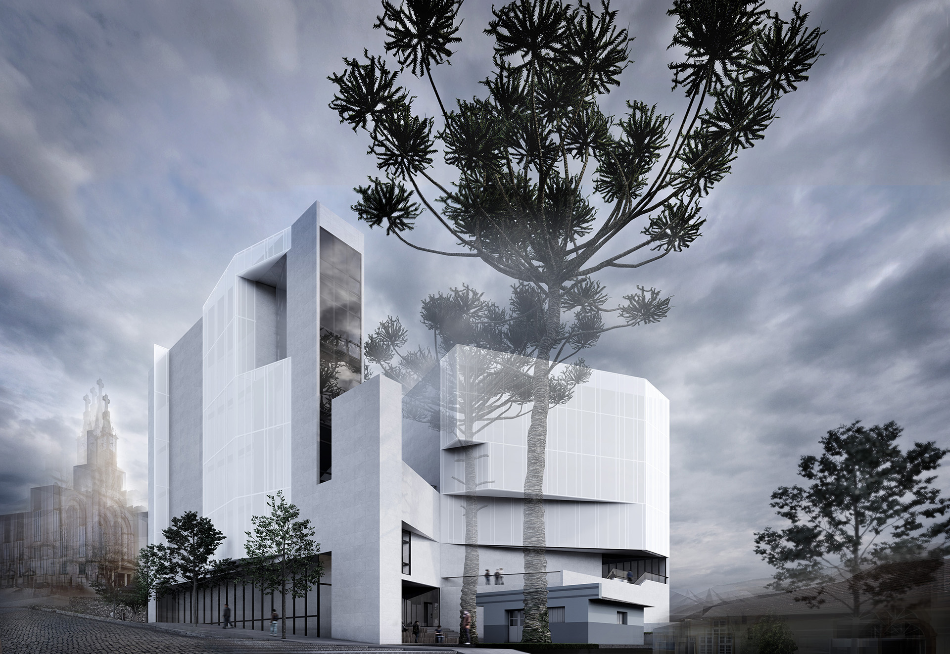 Sob uma perspectiva estritamente objetiva da ocupação do solo, o programa de pouco mais de 5.000m2 se desenvolve sobre um terreno de pouco menos de 1.400m2, que permite a utilização de quase 1.100m2 de área de projeção e verticalização restrita a 6 pavimentos, distribuídos em uma altura máxima de 27m. Somente com a materialização desses dados, ainda que a taxa de ocupação seja de generosos 80%, o volume conformado já se prenuncia como um elemento de massa, um bloco monolítico que se encrava em uma área urbana que hoje se caracteriza por um perfil uniforme e horizontal. Adicione-se, então, a particularidade de o terreno possuir em seus limites uma pequena edificação de 60m2 e valor histórico e cultural reconhecido pela memória local, escoltada por dois exemplares ainda jovens de Araucarea angustifolia, uma conífera símbolo da região Sul do Brasil que se destaca por alcançar alturas de quase 40 metros e viver por mais de 200 anos.