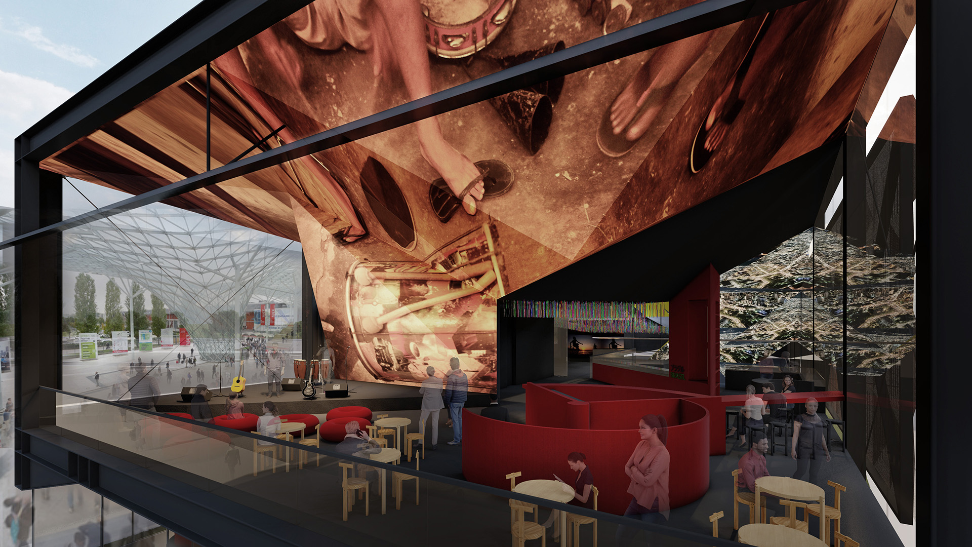 O palco para artes performáticas e o café logo no mezanino da fachada aberta para a praça seguem o mesmo princípio de franca exposição que permeia todo o conceito do pavilhão e mostram-se para o exterior na mesma medida que o fazem para o interior. Com o cair da tarde, o edifício também desenvolve o seu pleno potencial ao afastar a sua pele de palha e exibir toda a sua invisibilidade, estendendo assim as suas projeções para o público amplo da feira.