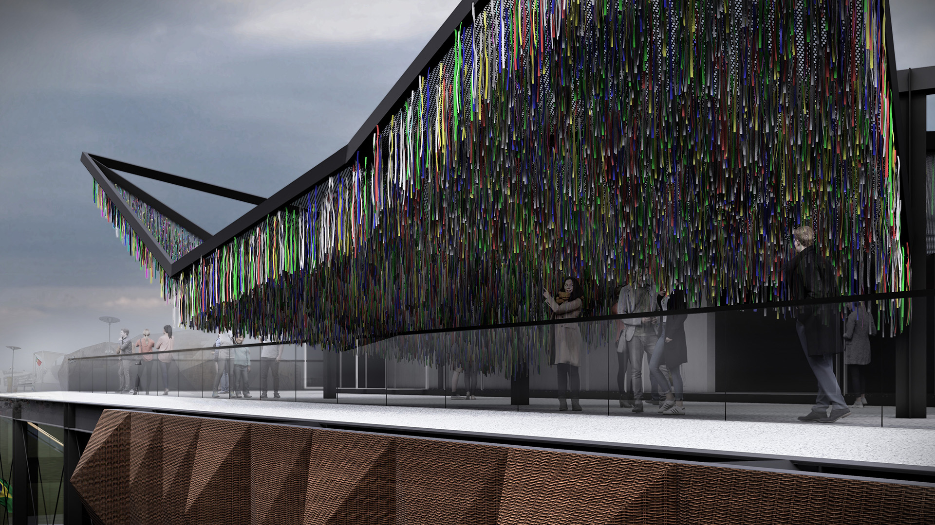 É também no terraço que ocorre a experiência coletiva: parte de sua cobertura se constitui de uma estrutura metálica modular que suporta as fitas – e os desejos – deixados pelos visitantes. Essa estrutura, visível desde o térreo, segue também a estratégia comum do edifício de fazer a exposição acontecer para muito além do limite de suas paredes.
