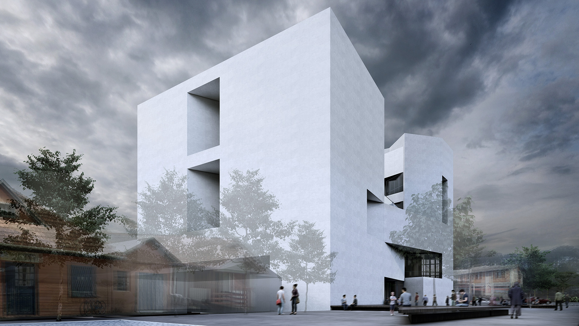 Sob uma perspectiva estritamente objetiva da ocupação do solo, o programa de pouco mais de 5.000m2 se desenvolve sobre um terreno de pouco menos de 1.400m2, que permite a utilização de quase 1.100m2 de área de projeção e verticalização restrita a 6 pavimentos, distribuídos em uma altura máxima de 27m. Somente com a materialização desses dados, ainda que a taxa de ocupação seja de generosos 80%, o volume conformado já se prenuncia como um elemento de massa, um bloco monolítico que se encrava em uma área urbana que hoje se caracteriza por um perfil uniforme e horizontal. Adicione-se, então, a particularidade de o terreno possuir em seus limites uma pequena edificação de 60m2 e valor histórico e cultural reconhecido pela memória local, escoltada por dois exemplares ainda jovens de Araucarea angustifolia, uma conífera símbolo da região Sul do Brasil que se destaca por alcançar alturas de quase 40 metros e viver por mais de 200 anos.