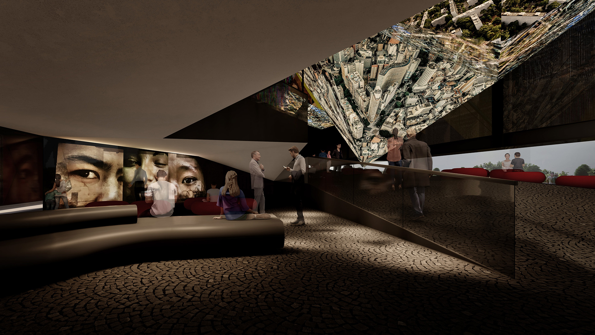Como as telas estão distribuídas majoritariamente no teto, o percurso da exposição é conformado como uma rampa, garantindo ao mesmo tempo um melhor ângulo para se observar as projeções, um percurso circular para toda a experiência expositiva – sem cruzamento de fluxo para o público –, e acessibilidade universal conseguida apenas com um uso mínimo de sistemas mecânicos convencionais.
